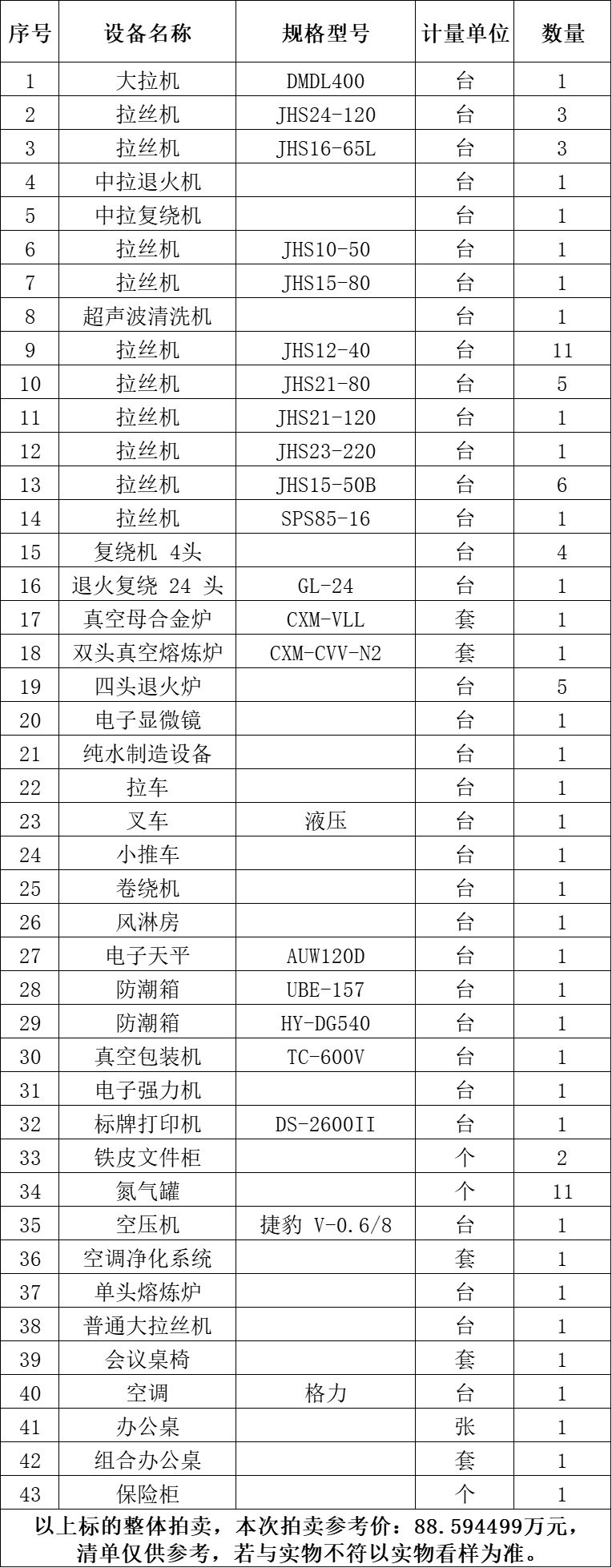 一、拍賣標(biāo)的:雙頭真空熔煉爐、真空母合金爐、空調(diào)凈化系統(tǒng)、拉絲機(jī)、復(fù)繞機(jī)4頭、大拉機(jī)、單頭熔煉爐等二手設(shè)備一批,整體拍賣,參考價(jià):88.594499萬元。競(jìng)買保證金:10萬元。