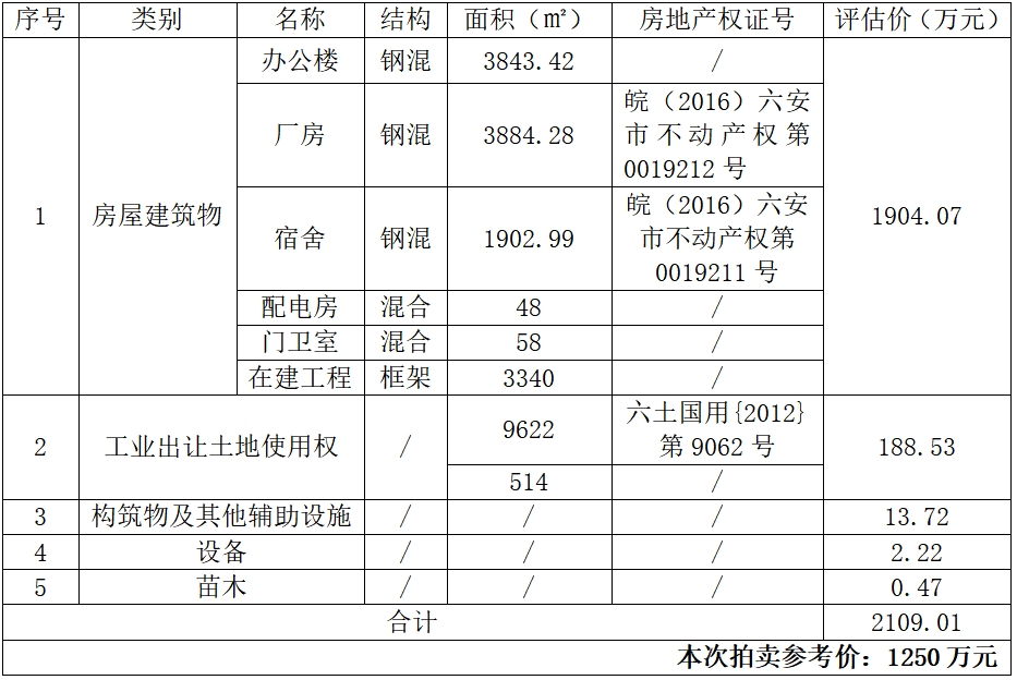 1.原六安市華宏印花有限公司所有的辦公樓、廠房、宿舍等房產(chǎn),總面積約13076.69㎡。其中宿舍樓和廠房有產(chǎn)權(quán)證。