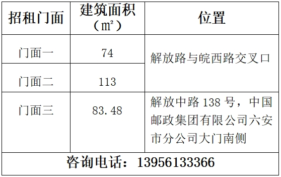 解放中路與皖西路交叉口國有沿街門面房三處,現(xiàn)對外招租,招租詳情如下: