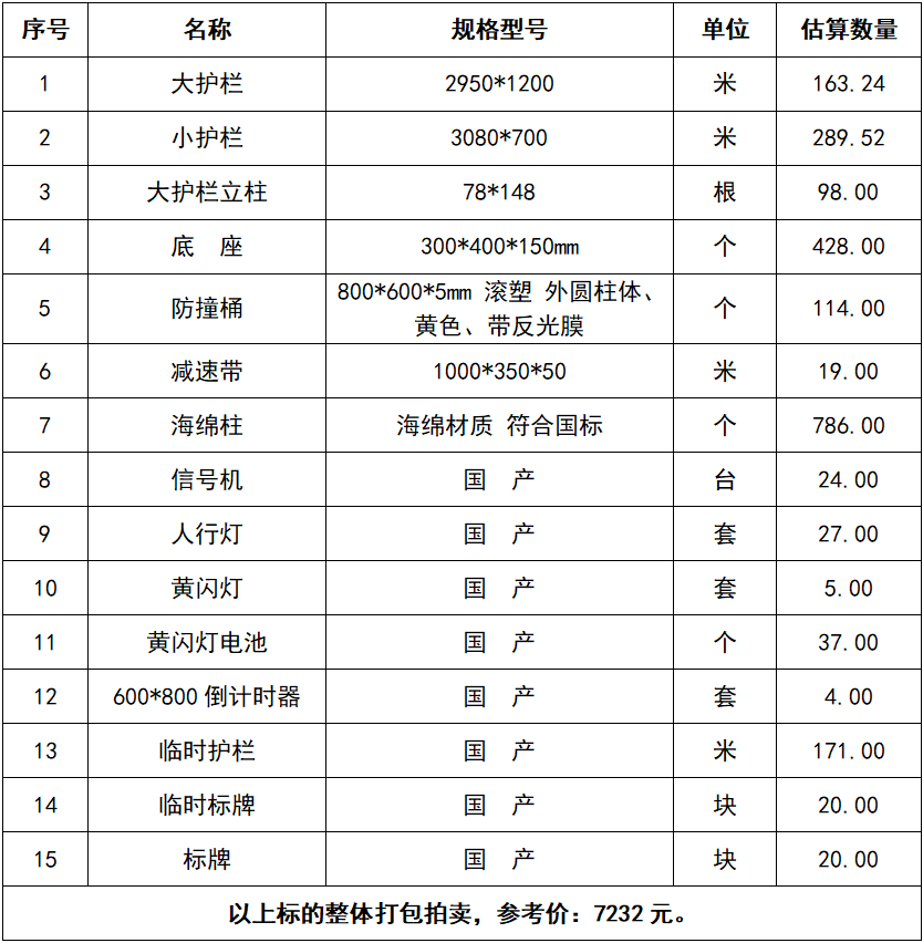 一、拍賣標(biāo)的:廢舊物資一批,包括護(hù)欄、防撞桶、黃閃燈電池等,參考價(jià):7232元。