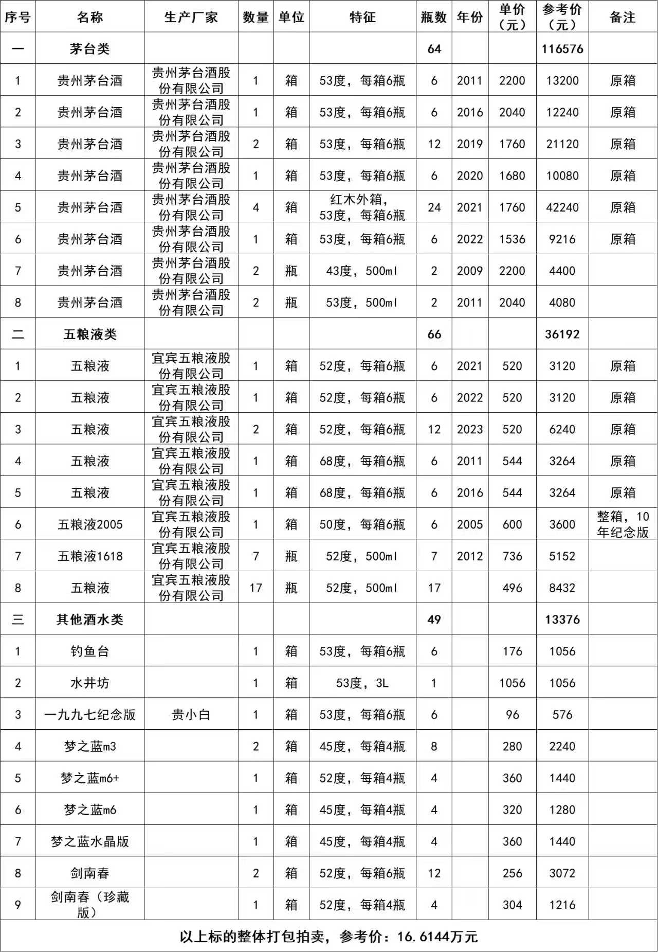 1、貴州茅臺酒計(jì)64瓶、五糧液酒計(jì)66瓶及其他類酒水計(jì)49瓶,整體打包拍賣,參考價(jià):16.6144萬元,競買保證金:2萬元。標(biāo)的詳情見下方清單: