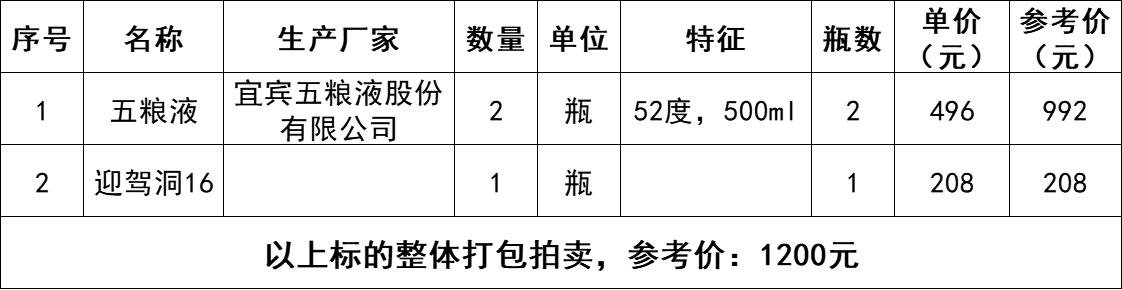 2、五糧液酒2瓶、迎駕洞藏16酒1瓶,整體打包拍賣,參考價(jià):1200元,競買保證金:1000元。標(biāo)的詳情見下方清單: