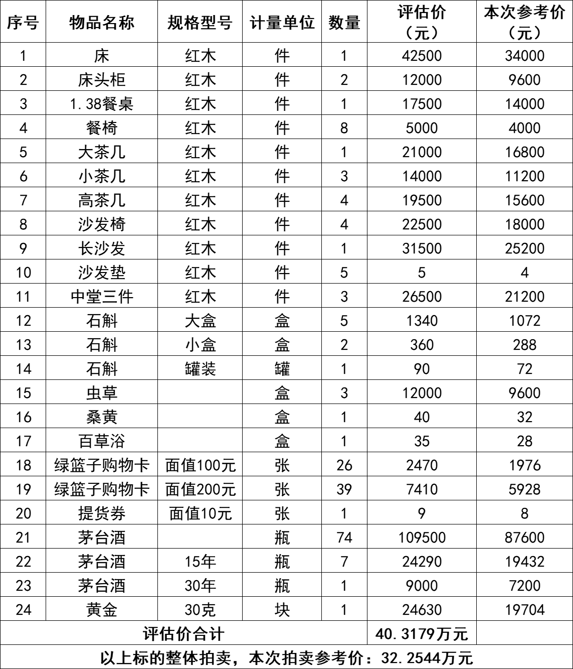 一、拍賣(mài)標(biāo)的:茅臺(tái)酒、黃金、紅木家具等物品一批,整體打包拍賣(mài),參考價(jià):32.2544萬(wàn)元。競(jìng)買(mǎi)保證金:6萬(wàn)元。詳見(jiàn)下方明細(xì)表:
