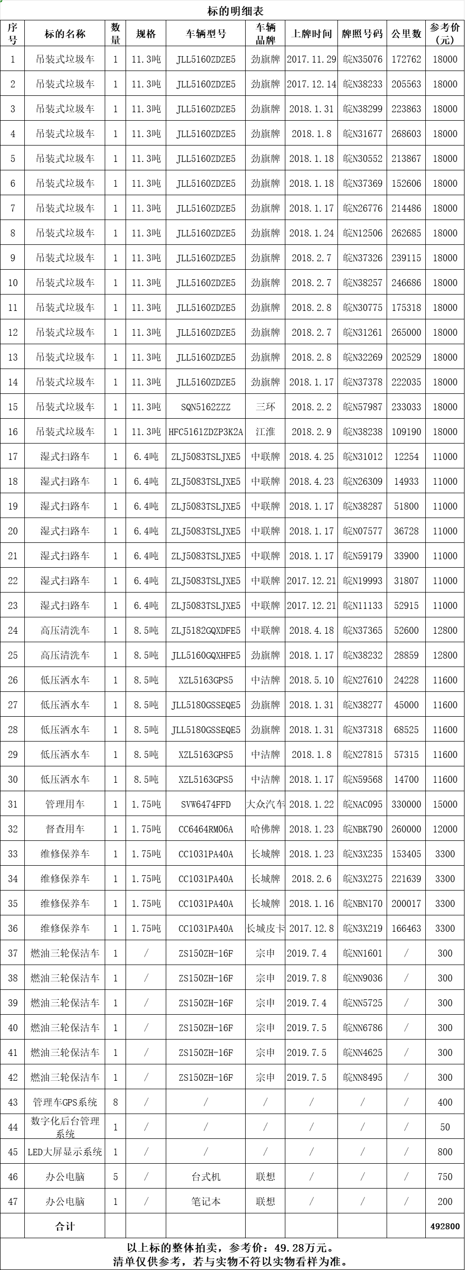 吊裝式垃圾車16輛、濕式掃路車7輛、高壓清洗車2輛、低壓灑水車5輛、管理用車1輛、督查用車1輛、維修保養(yǎng)車4輛、燃油三輪保潔車6輛、辦公電腦6臺(tái)以及管理車GPS系統(tǒng)等整體拍賣(mài),拍賣(mài)參考價(jià):49.28萬(wàn)元。