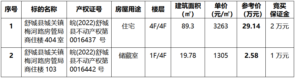 一、拍賣標的:舒城縣城關鎮(zhèn)梅河路房管局商住樓404室住宅房及103儲藏室,拍賣標的詳情見下表: